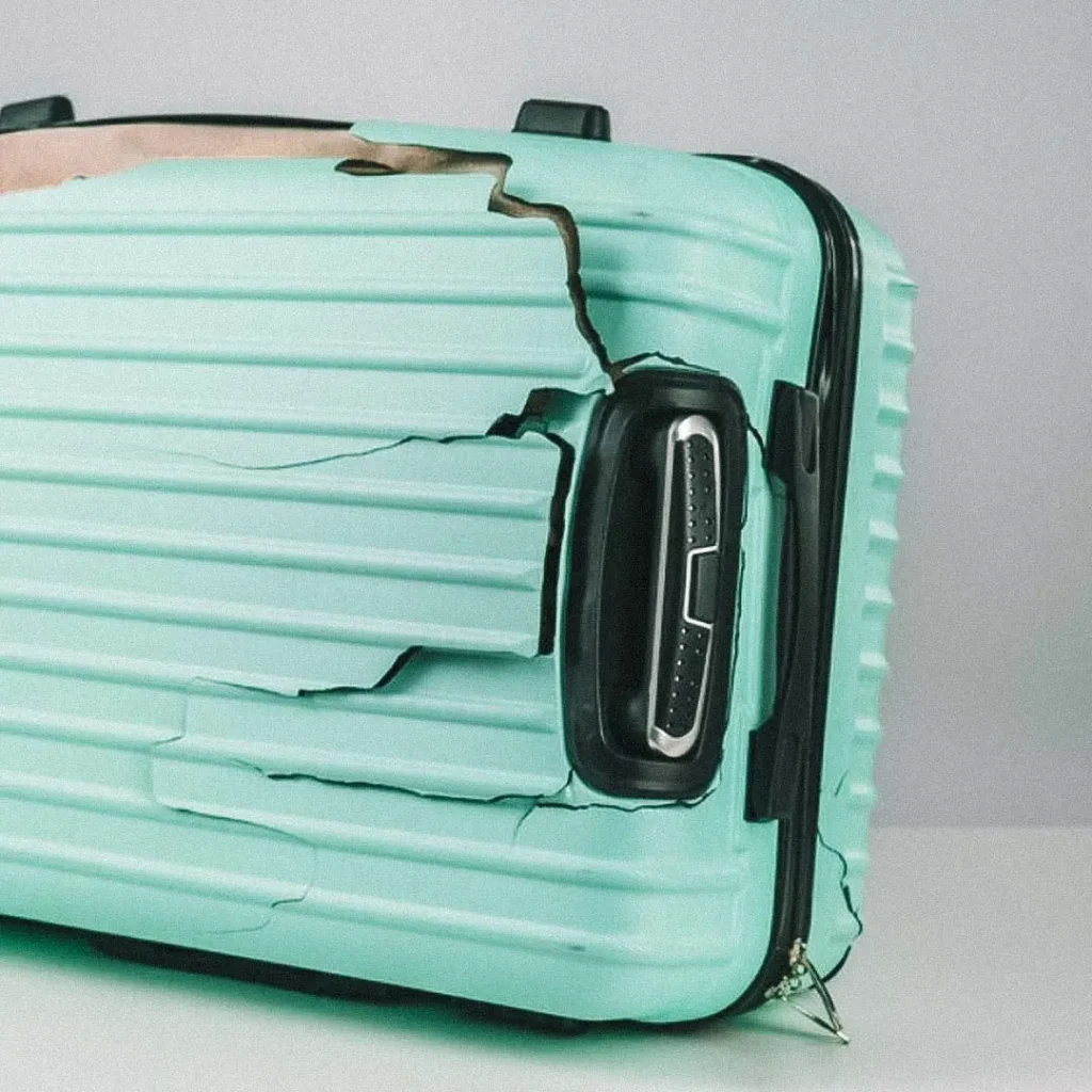 Bagagem danificada inclui qualquer avaria visível ou funcional que comprometa a integridade da mala. Isso inclui: